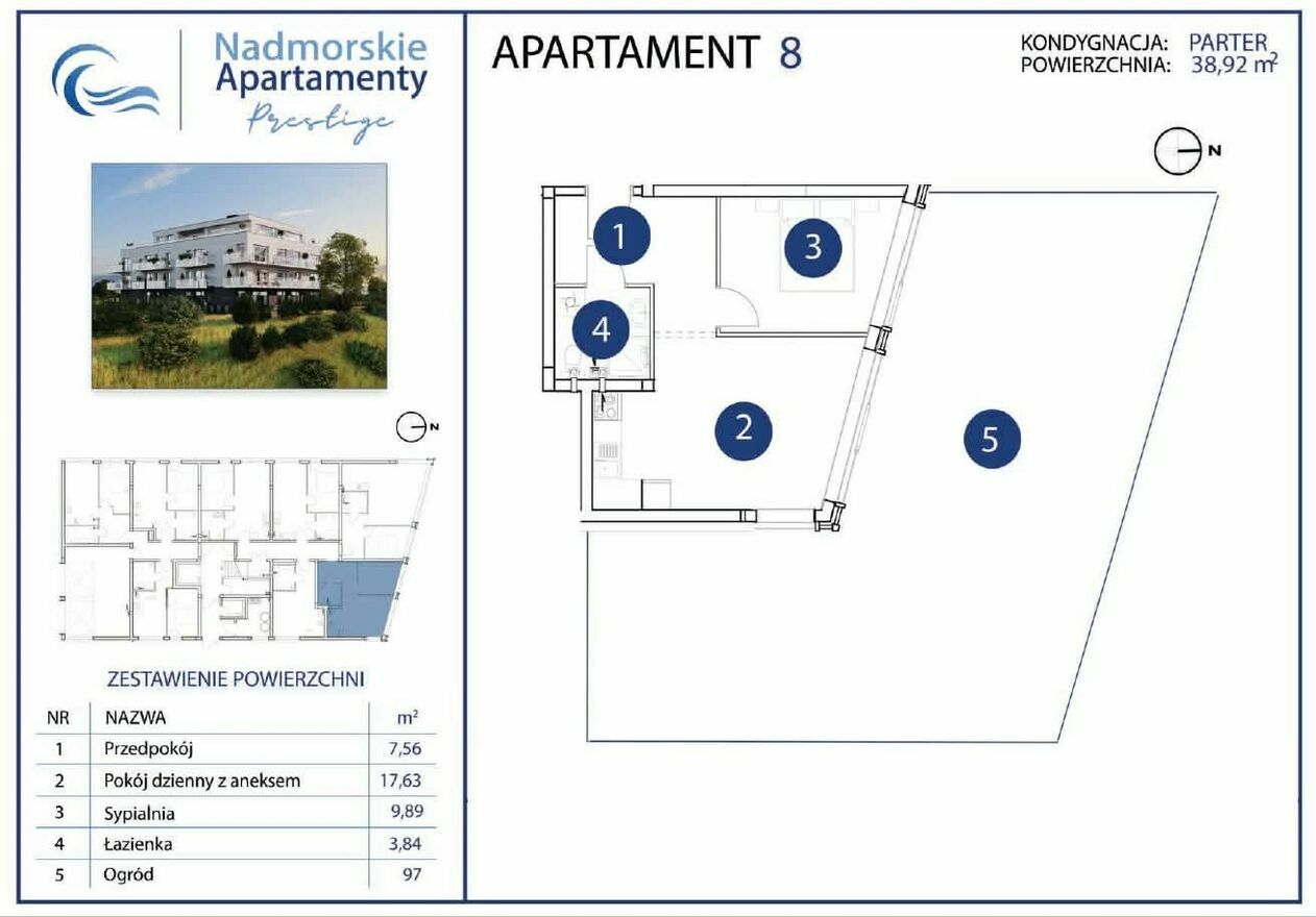Apartament 2 pokojowy frontowy na parterze, z oknami panoramicznymi o powierzchnia 38,9 m2, z ogrodem o powierzchni 97 m2.